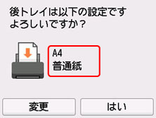 表示された用紙のサイズと種類が、後トレイにセットした用紙と同じであれば、[はい]を選びます。