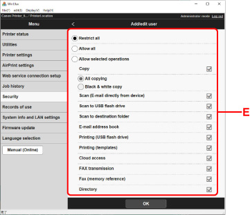 Khi quản lý nhiều người dùng, hãy chọn LCD, Remote UI hoặc c.c khác(LCD, Remote UI, and other tools) trong Cài đặt mật khẩu quản trị(Administrator password settings).