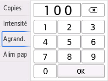 L'écran ci-dessous s'affiche lorsque vous sélectionnez Paramètres sur l'écran d'attente de copie, puis Agrand. pour sélectionner la méthode de réduction ou d'agrandissement. Spécifiez l'agrandissement et sélectionnez OK.