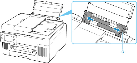 Pastumdami dešinįjį popieriaus kreipiklį (C) atidarykite abu popieriaus kreipiklius.