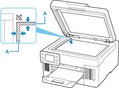 Spausdintuvas negali nuskaityti įstrižai subrūkšniuotos srities (A) (1 mm (0,04 col.) nuo ekspozicinio stiklo kraštų).