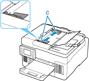 4. Glisaţi ghidajul pentru documente (C) în exterior, până la capăt.