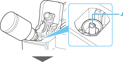 Aliniind vârful sticlei de cerneală cu orificiul de umplere (J) al rezervorului de cerneală, răsturnaţi încet sticla şi împingeţi-o în orificiul de umplere.