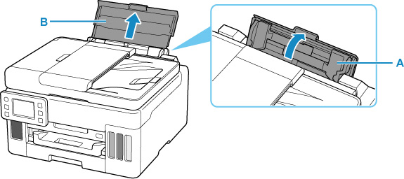 開啟後端托盤蓋(A),然後抬起托紙架(B)。