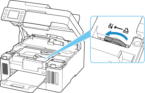 Uždarykite rašalo vožtuvą tvirtai pastumdami rašalo vožtuvo svirtelę į kairę.