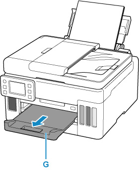 Ištraukite popieriaus išvesties dėklą (G).