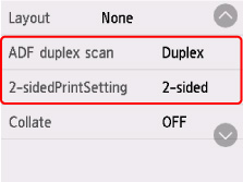 Selectaţi Setări (Settings) pe ecranul de standby pentru copiere pentru a afişa ecranul cu setările de imprimare. Selectaţi Set imp faţă-verso (2-sidedPrintSetting) la Faţă-ver. (2-sided), apoi selectaţi OK.