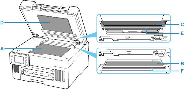 Ja uz stikla virsmas (B un C) ir līme, tinte, korekcijas šķidrums vai citas vielas, skenētajos attēlos var būt melnas svītras. Uzmanīgi noslaukiet no stikla visas šīs vielas.