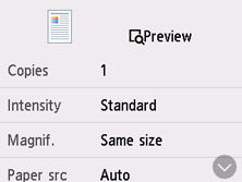 Ecranul cu setările de imprimare se afișează când selectați Setări (Settings) pe ecranul de standby pentru copiere.
