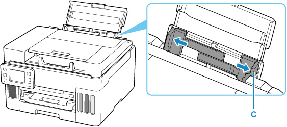 Posuňte pravú vodiacu lištu papiera (C), aby sa otvorili obe vodiace lišty papiera.