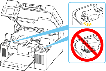 • Įsitikinkite, kad rašalo talpyklų dangteliai tvirtai uždaryti. Jei talpyklų dangteliai atidaryti, tinkamai uždarykite talpyklų dangtelius.