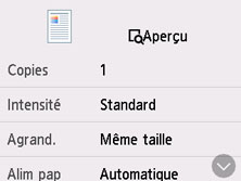 Lorsque Aperçu s'affiche sur l'écran des paramètres d'impression, sélectionner Aperçu vous permet d'afficher un aperçu de l'impression sur l'écran d'aperçu.