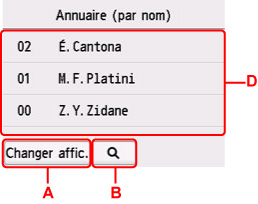 B: Sélectionnez pour afficher l'écran de sélection d'une initiale. Vous pouvez rechercher le destinataire enregistré d'après son initiale.