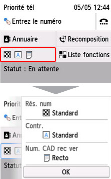 Vous pouvez modifier les paramètres d'envoi tels que le contraste ou la résolution de numérisation dans l'écran d'attente de fax.