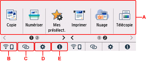 Appuyez sur l'écran ACCUEIL sur l'écran tactile avec votre doigt pour sélectionner des menus pour copier, numériser et accéder à d'autres fonctions.