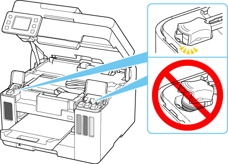 Asiguraţi-vă că sunt închise bine capacele rezervoarelor de la rezervoarele de cerneală. În cazul în care capacele rezervoarelor sunt deschise, închideţi capacele rezervoarelor în mod corespunzător.