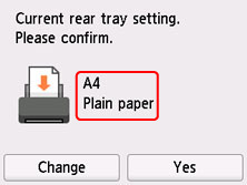 Dacă dimensiunea de pagină de pe ecranul senzitiv corespunde cu dimensiunea hârtiei încărcate în tava din spate, selectaţi Da (Yes).