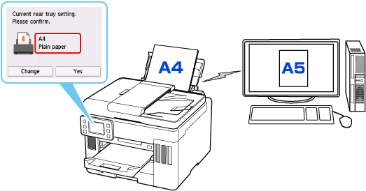- De exemplu, când setarea pentru hârtie pentru imprimare/copiere este A5 şi informaţiile despre hârtie înregistrate în imprimantă indică dimensiunea A4, imprimanta începe imprimarea/copierea pe hârtia încărcată în tava din spate sau în casetă, fără a schimba setarea pentru dimensiunea hârtiei pentru imprimare/copiere.