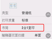 在复印待机屏幕上选择设置以显示打印设置屏幕。 在布局中选择2合1复印,然后选择OK。