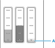 Dacă nivelul de cerneală rămasă se află sub linia limitei inferioare (A), reumpleţi rezervorul de cerneală cu culoarea de cerneală corespunzătoare.
