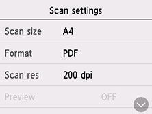 عند عرض شاشة الاستعداد للمسح الضوئي، حدد Scan settings لتحديد عنصر الإعداد. حرّك لعرض عناصر الإعداد، ثم حدد عنصر الإعداد لعرض الإعدادات. حدد لتعيين الإعداد المطلوب.