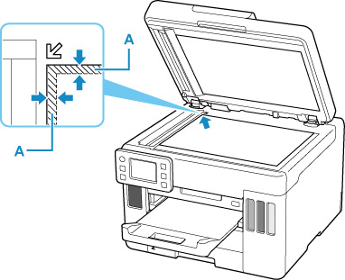 • لا يمكن للطابعة إجراء المسح الضوئي للمنطقة المخططة (‏A)‏ (‏1 مم (‏0.04 بوصة)‏ من حواف السطح الزجاجي)‏.