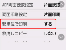 コピー待機画面で[印刷設定]を選んで印刷設定画面を表示し、[部単位で印刷]を選んで、[する]を選びます。
