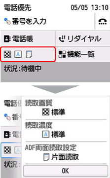 ファクス待機画面で、読取画質や読取濃度など、ファクスを送信するときの設定を変更できます。