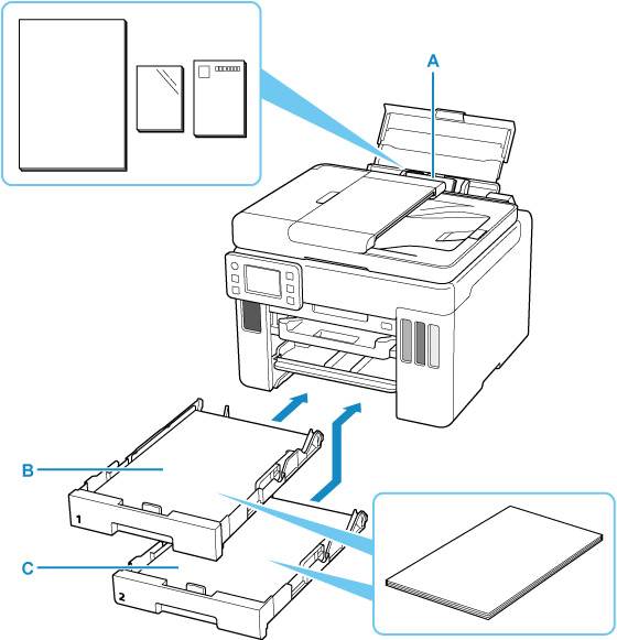 用紙は、後トレイ(A)とカセット1(B)/カセット2(C)にセットすることができます。