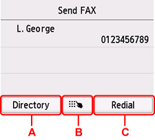 B: Vises hvis du spesifiserte en første mottaker fra de registrerte mottakerne. Legger til mottakeren ved å legge inn faks-/telefonnummer.
