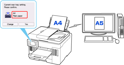 - När exempelvis inställningen för pappersstorlek för utskrift/kopiering är A5 och pappersinformationen som har registrerats i skrivaren är A4 börjar skrivaren skriva ut/kopiera på det papper som fyllts på i det bakre facket eller i kassetten utan att ändra inställningen för pappersstorlek för utskrift/kopiering.