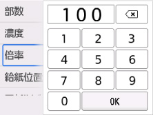 コピー待機画面で[印刷設定]を選んで印刷設定画面を表示し、[倍率]を選ぶと拡大/縮小方法が表示されます。倍率を指定して、[OK]を選びます。