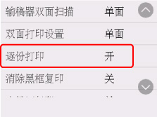 在复印待机屏幕上选择设置以显示打印设置屏幕。 选择逐份打印,然后选择开。