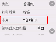 在复印待机屏幕上选择设置以显示打印设置屏幕。 在布局中选择2合1复印,然后选择OK。