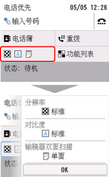 可以在传真待机屏幕上更改扫描对比度或扫描分辨率等发送设置。