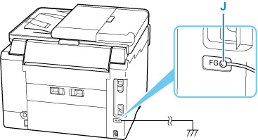 连接地线时,将其与位于打印机后侧的框架接地(J)固定。安装打印机时,请务必小心不要使打印机压毁地线。