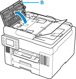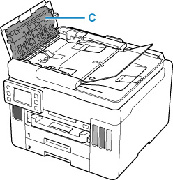 Dùng miếng vải đã chuẩn bị để lau sạch tất cả bụi giấy từ bên trong nắp bộ nạp tài liệu (C).