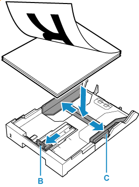 Glisaţi ghidajele pentru hârtie (B) spre partea frontală şi (C) spre dreapta pentru a deschide ghidajele.
