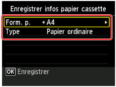 Une fois que vous avez inséré la cassette, un écran d'enregistrement des informations sur le papier pour la cassette s'affiche sur l'écran LCD.