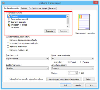 Dans le champ Paramètres courants de l'onglet Configuration rapide, sélectionnez un profil adapté à votre tâche d'impression.