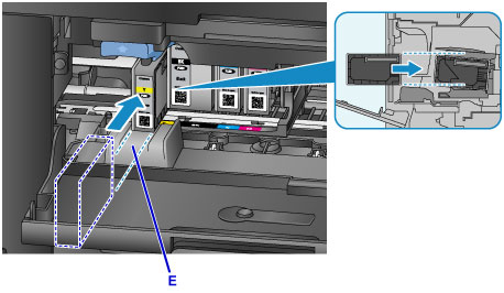 新しいインクタンクを本体の取り付けガイド(E)に沿わせて差し込む
