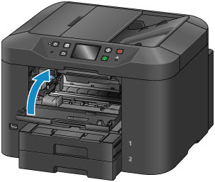 - Wenn Sie die vordere Abdeckung länger als 60 Minuten geöffnet lassen, bewegt sich der Druckkopfhalter nach rechts. In diesem Fall sollten Sie die vordere Abdeckung schließen und erneut öffnen.