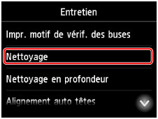 Une fois le nettoyage terminé, un écran de confirmation s'affiche pour procéder à l'impression du motif de vérification des buses.