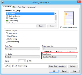 Στην καρτέλα Προέλευση χαρτιού (Paper Source), επιλέξτε την κασέτα στην οποία έχετε τοποθετήσει χαρτί.