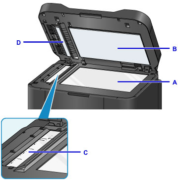 Pyyhi tahrat tai pöly pois tasolta (A), asiakirjakannen pohjasta (B, valkoinen), ADF:n (automaattinen asiakirjansyöttölaite) lasipinnalta (C) ja ADF:n pohjasta (D, valkoinen).