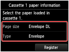 Select the size and type of envelopes in the cassette in Page size and Type, and then tap Register.