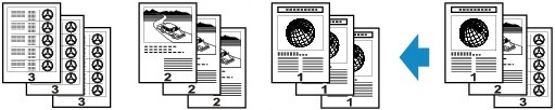 عند تحديد ON لـ Collate في Copy، يمكنك الحصول على نُسخ مطبوعة مرتبة عند طباعة نُسخ متعددة من مستند أصلي متعدد الصفحات. بالإضافة إلى ذلك، يمكنك نسخ صفحات أصلية على وجهي ورقة واحدة.