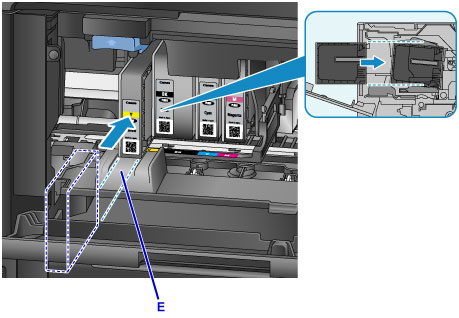 Setzen Sie den neuen Tintenbehälter ein, indem Sie ihn an den Führungslinien (E) des Geräts ausrichten.