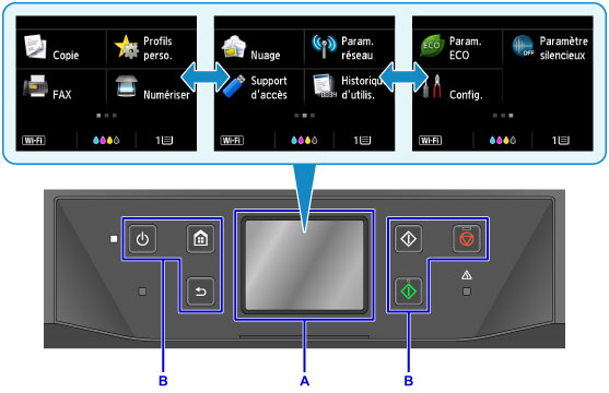 Le panneau de contrôle est doté d'un écran tactile (A) et de boutons (B).