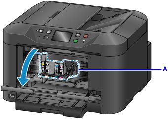 Les cartouches d'encre à remplacer sont identifiées sur l'écran tactile et le support de tête d'impression (A) se déplace vers la position de remplacement de ces cartouches d'encre.
